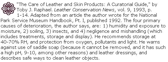 "The Care of Leather and Skin Products: A Curatorial Guide," by Toby J. Raphael. Leather Conservation News, vol. 9, 1993, p. 1-14.