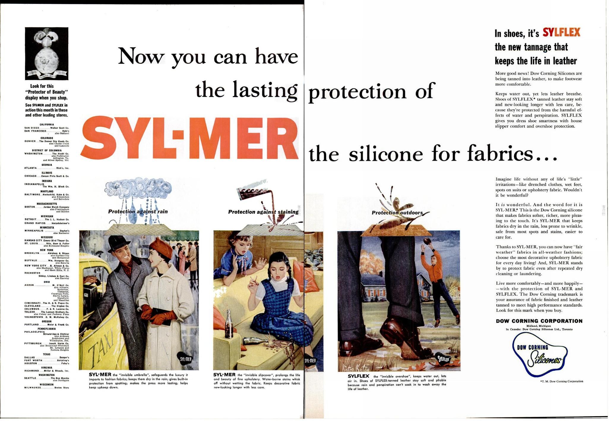 靴メーカー数社が、永久防水であり、屈曲状態で水を通さない革(履き皺から浸水しないという意味か?)を使った靴を今春(1955年)製造する。この革の新概念の登場は、柔軟性と通気性を保ちつつ防水性を上げるためのダウコーニング社のシリコーン製品である Sylflex で、靴用甲革を鞣した賜物だ。